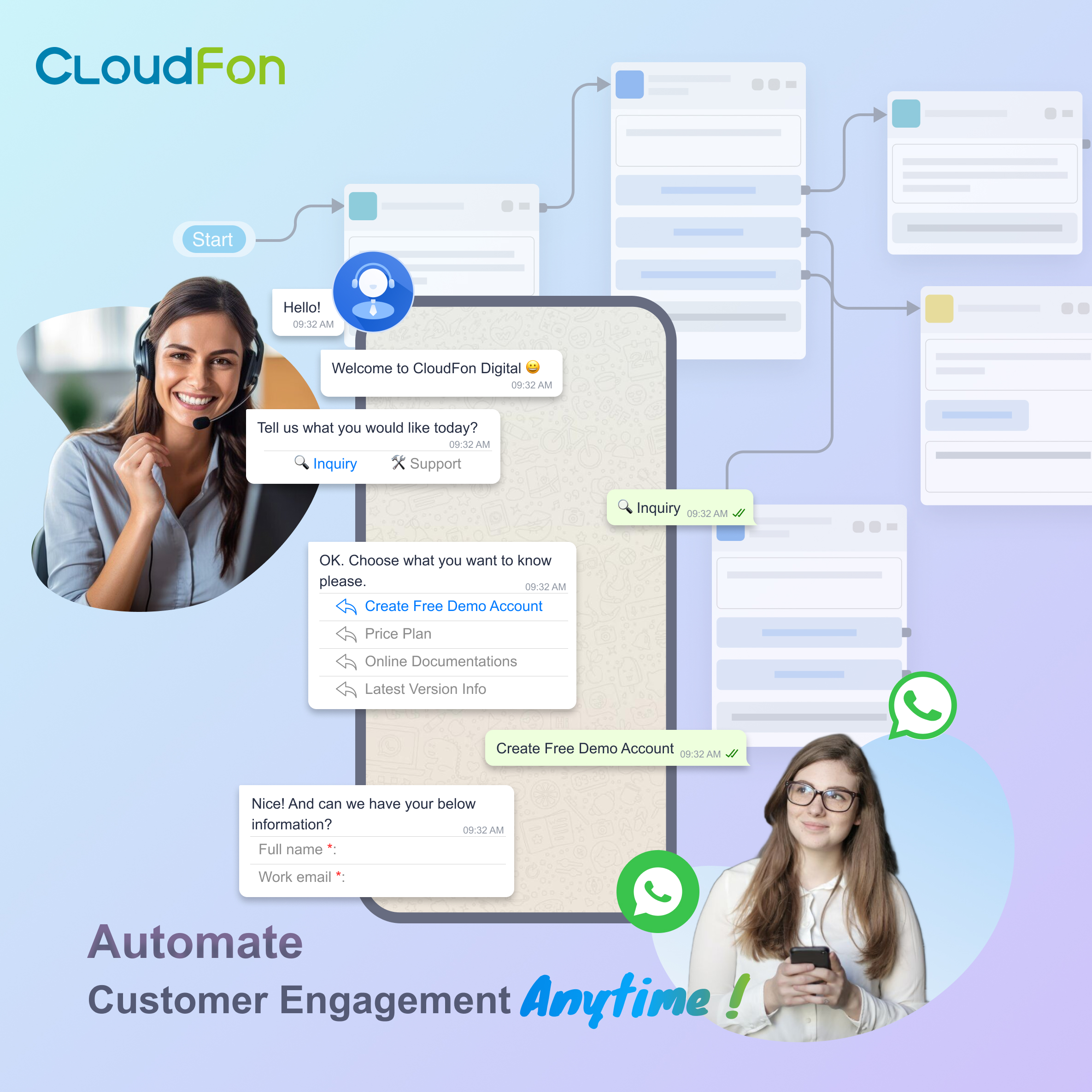 WhatsApp workflow automation is the use of CloudFon automated systems to streamline and optimize communication processes on WhatsApp's messaging platform.
